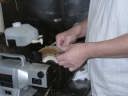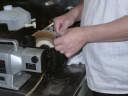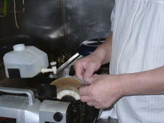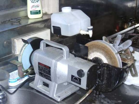 鋏の裏梳きグラインダーg@が、我が愛用品の裏梳きグラインダーです。ホームセンターで確か7,500円で購入しました、水磨ぎ双頭グラインダーにホームセンターで購入したBSスコーライトフラップ粒度細目、砥粒C・2,880円、と布バフを装着し青棒研磨剤で磨きを掛けます